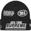 Acrylic cuffed beanie featuring embroidered logos on the front and back cuff, with additional embroidered graphics on the crown and cuff. FW25 / Black.